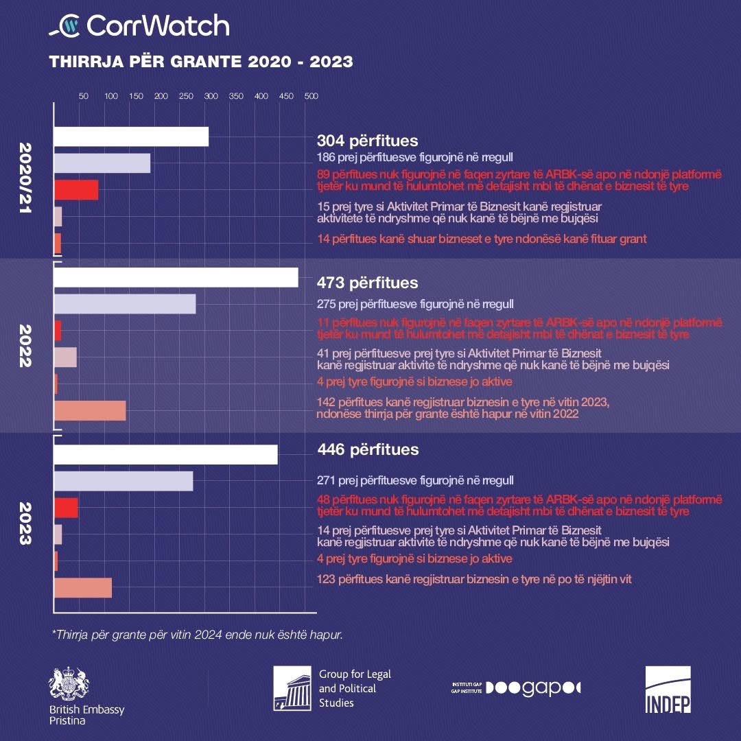 Nga CorrWatch është thënë se “disa biznese përfituese: Kanë veprimtari që nuk lidhen me bujqësinë sipas ARBK-së, nuk janë të regjistruara ose janë regjistruar pas thirrjes, kanë mbyllur aktivitetin e tyre pas marrjes së grantit”.