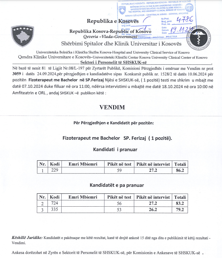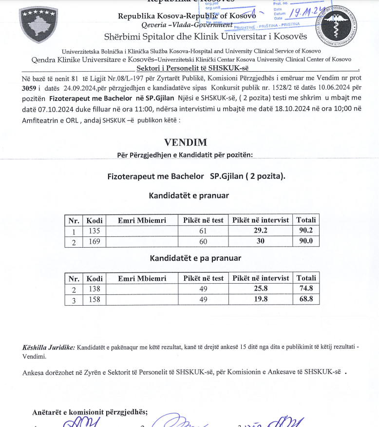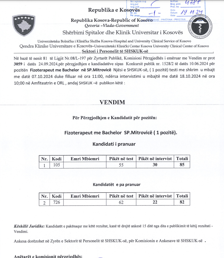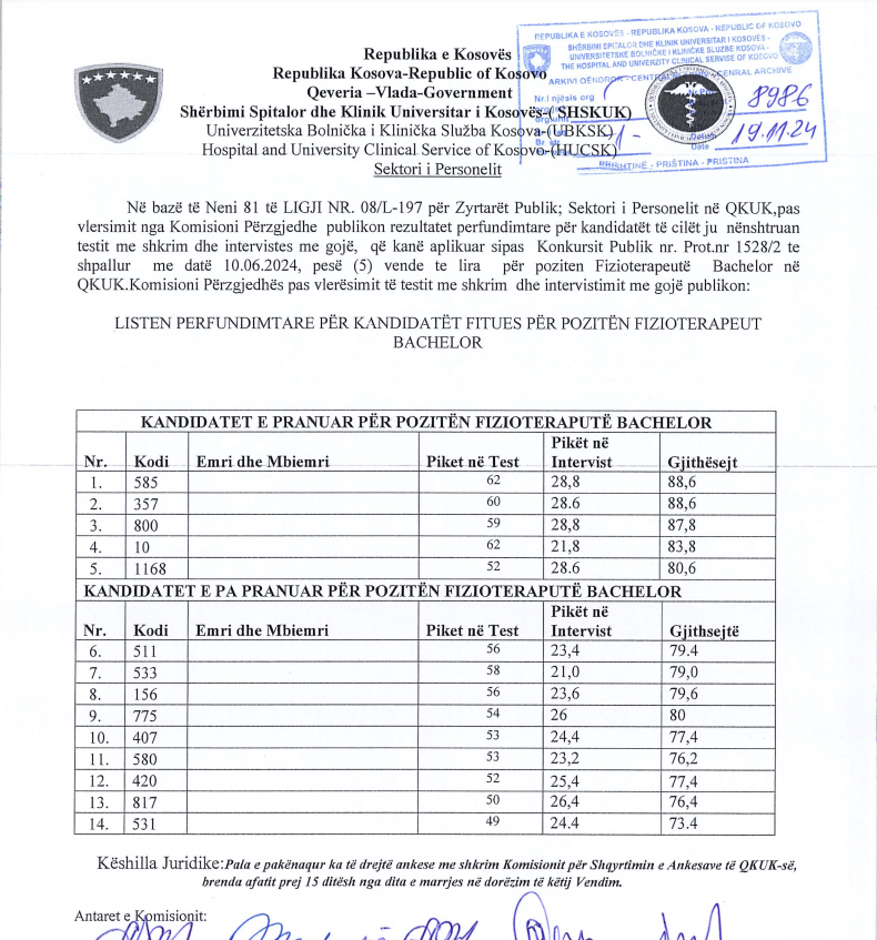 Ndryshe, SHSKUK më 19 nëntor ka publikuar rezultatet përfundimtare për këtë pozitë, në QKUK dhe në Spitalet Regjionale.