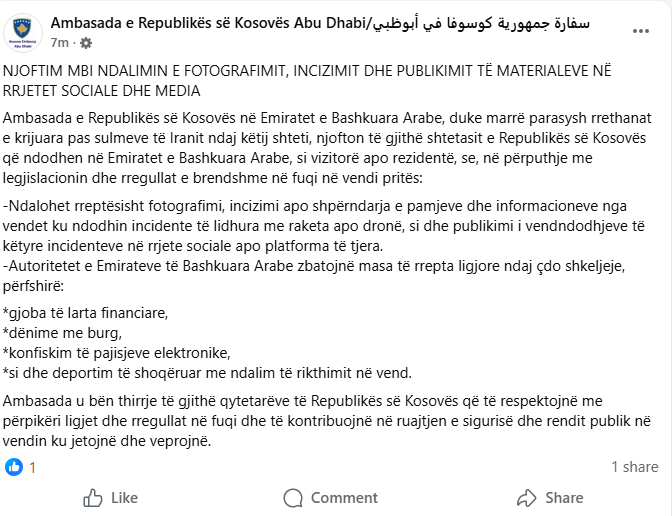 Përmes një postimi në Facebook, nga kjo Ambasadë ka thënë se në përputhje me legjislacionin dhe rregullat e brendshme në fuqi në vendi pritës, ndalohet rreptësisht fotografimi, incizimi apo shpërndarja e pamjeve dhe informacioneve nga vendet ku ndodhin incidente të lidhura me raketa apo dronë, si dhe publikimi i vendndodhjeve të këtyre incidenteve në rrjete sociale apo platforma të tjera.