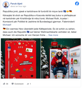 “Kënaqësi të shoh se Republika e Kosovës është kaq bukur e përfaqësuar në kartolinën për Krishtlindje të mikut tonë, Michael Roth, kryetar i Komisionit për Politikë të Jashtme të Bundestagut gjerman. Faleminderit Michael!”, ka shkruar Ajeti.