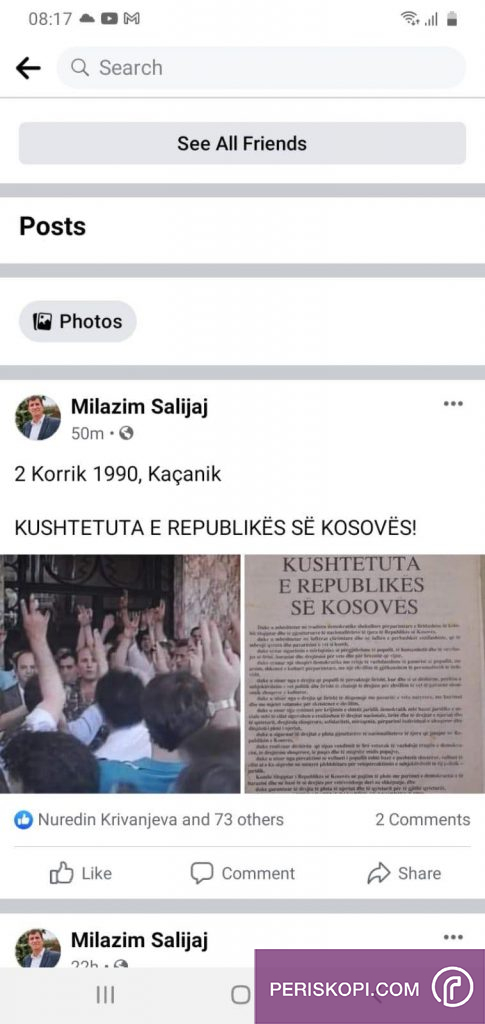 Salijaj me anë të një postimi në Facebook ka shkruar “2 korrik 1990, Kaçanik. Kushtetuta e Republikës së Kosovës”.