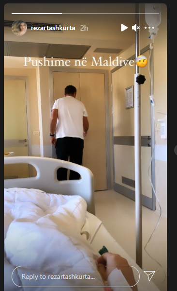 Në imazhin e ndarë me fansat në InstaStory, Rezarta tregon veten e saj të shtrirë në krevatin e spitalit, dhe burrin e saj duke dalë jashtë dhomës.
