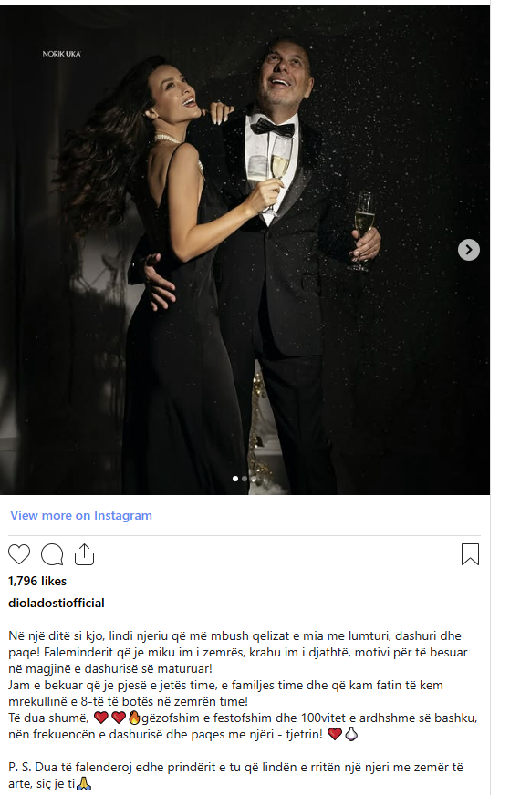 “Në një ditë si kjo lindi njeriu që më mbush qelizat e mia me lumturi, dashuri dhe paqe. Faleminderit që je miku i zemrës, krahu im i djathtë, motivi për të besuar në dashurinë e maturuar. Jam e bekuar që je pjesë e jetës sime, e familjes time dhe që kam fatin të kem mrekullinë e 8-të të botës në zemrën time”
