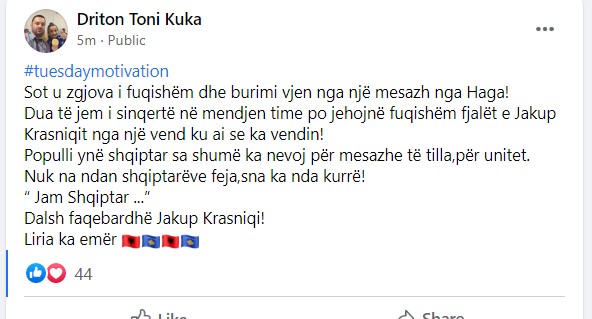 Me anë të një postimi në Facebook sot, ai potencon se është zgjuar i fuqishëm duke mbajtur në mendje fjalët e Krasniqit.