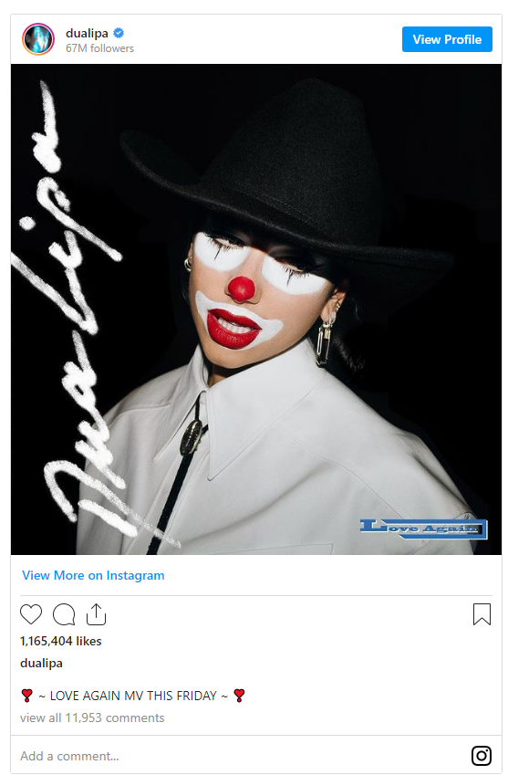 Dua duket si një palaço seksi në fotografinë prezantuese të klipit të ri muzikor, teksa edhe pranoi 1 milion pëlqime brenda orës së parë të postimit dhe dhjetëra mijëra komente.