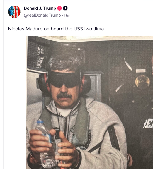 Duart e lidhura dhe sytë e mbyllur, Trump shpërndan fotografinë e parë të Maduros pas arrestimit