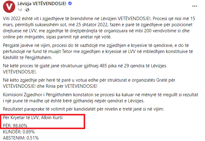 Partia në pushtet – e kryeministrit Albin Kurti, të dielën që lamë pas, zhvilloi procesin zgjedhor për kryetar të partisë si dhe për kryetarë të qendrave të kësaj partie nëpër Kosovë. Për udhëheqës të partisë, fitoi Kurti me gati 100% të votave – pasi askush nuk e sfidoi. Kjo përqindje u publikua. Por, ajo që nuk u publikua është përqindja e votave të atyre që morën në udhëheqje qendrat e Vetëvendosjes. Një burim pranë kësaj partie, hedh dyshime se janë ‘manipuluar votat’ për kryetarë qendrash, sidomos për ato që thotë se kishte qasje në to si: Prishtinë, Ferizaj, Podujevë, Mitrovicë, Viti dhe Lipjan. Sipas statistikave, po ashtu, këto janë zgjedhjet e brendshme të partisë në pushtet, me pjesëmarrjen më të ulët ndonjëherë, të anëtarësisë së saj. Kjo, shihet edhe me mos-praninë virtuale të partisë në pushtet të dielën, ku pamë veç pak fotografi, ato të Kurtit duke votuar…