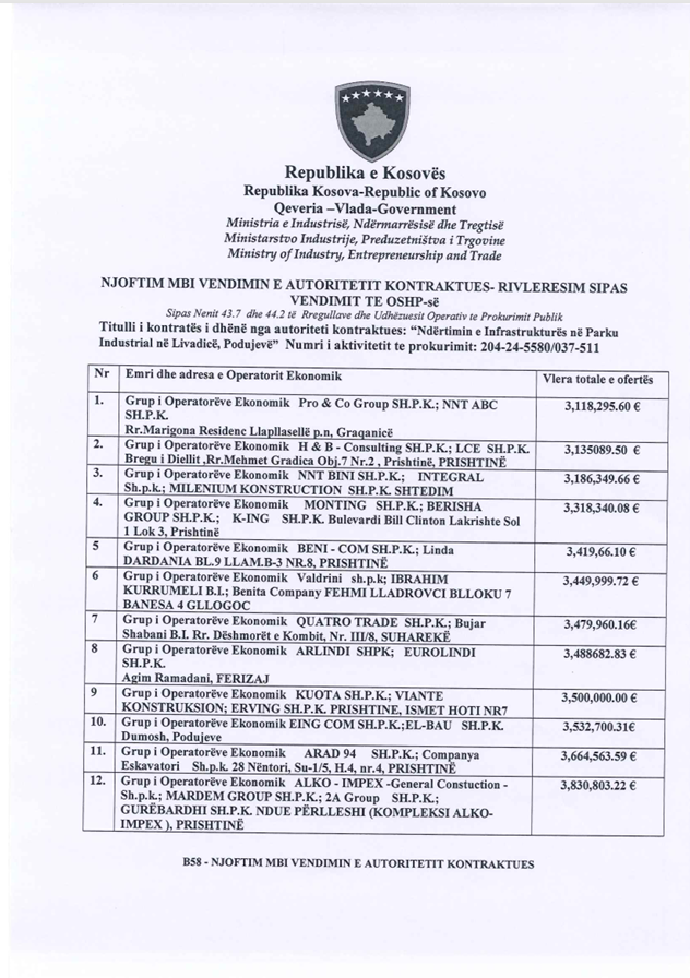 Gjithçka nisi me zhvillimin e tenderit me vlerë 3,118,295.60 euro për ndërtimin e infrastrukturës në Parkun Industrial në Livadicë të Podujevës, i cili u shoqërua me ankesa nga operatorët ekonomikë pjesëmarrës.