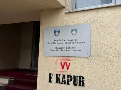 Në murin e objektit tek Prokurori i Shtetit PSD ka shkruar “Prokurori e kapur nga VV”.