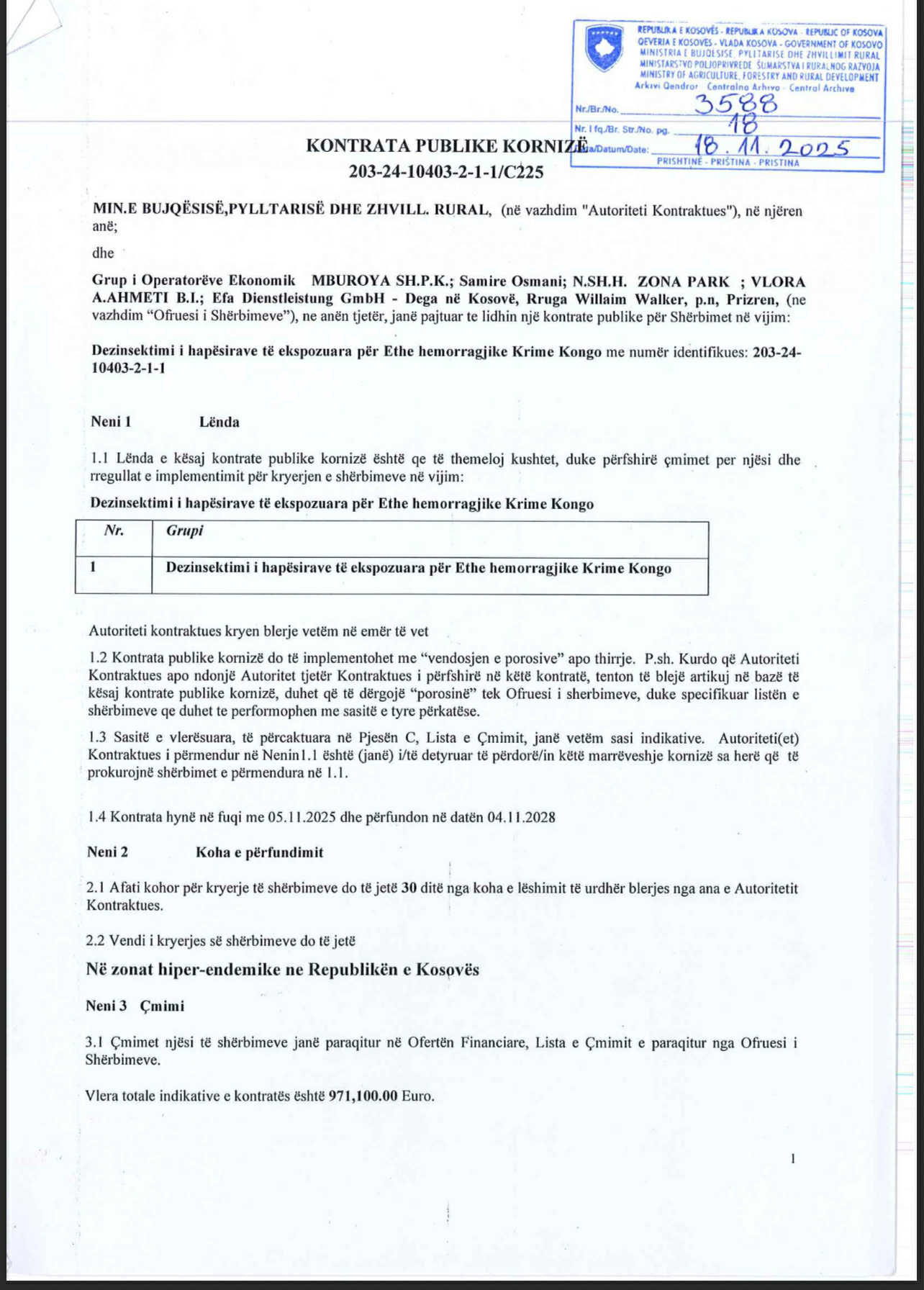Më poshtë gjeni kontratën e dhënë për këtë kompani nga Faton Peci sa ishte ministër i Bujqësisë, e kishte nënshkruar me 18.11.2025: