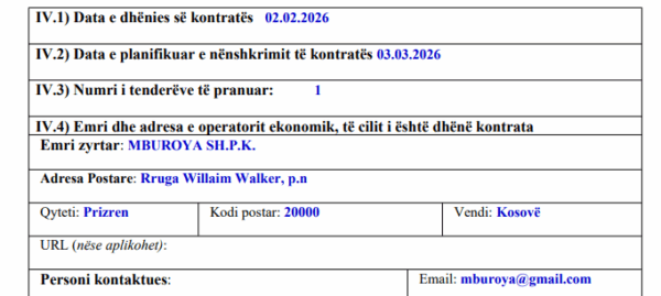 Bëhet fjalë për kompaninë “MBUROYA SH.P.K.”, e cila ka fituar kontratën për shërbime të mirëmbajtjes dhe pastrimit, me vlerë rreth 36 mijë euro, përmes procedurës së negociuar – pa konkurrencë dhe pa garë të hapur.