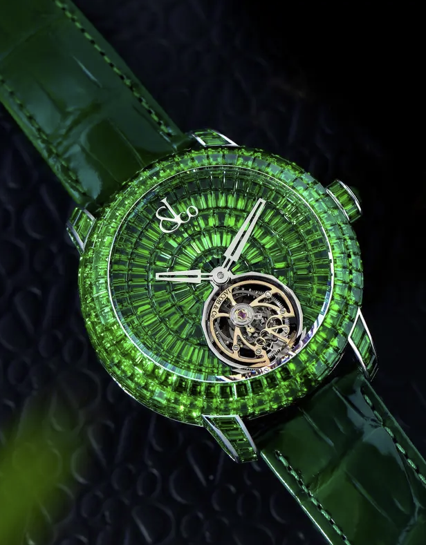 Ronaldo është një ambasador i markës për Jacob & Co dhe ata kanë krijuar një ‘Caviar Flyin Tourbillon’ të veçantë. Ora, me dizajnin e saj 18 Karat ari i bardhë 47mm x 15,85mm, ka 388 gurë të çmuar Tsavorite jeshile.