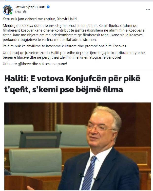 Spahiu ka shkruar se nuk pajtohet me Xhavit Halitin lidhur me këtë deklaratë pasi Kosova duhet të investoi në prodhimin e filmit.