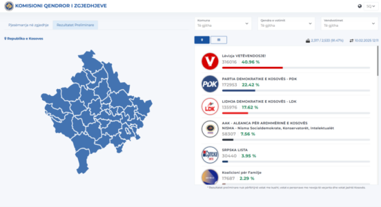 Lëvizja Vetëvendosje ka 316,016 vota apo 40.96%, nga 91.47% të vendvotimeve të procesuara, sipas të dhënave të fundit të Komisionit Qendror të Zgjedhjeve, të përditësuara në orën 12:11.