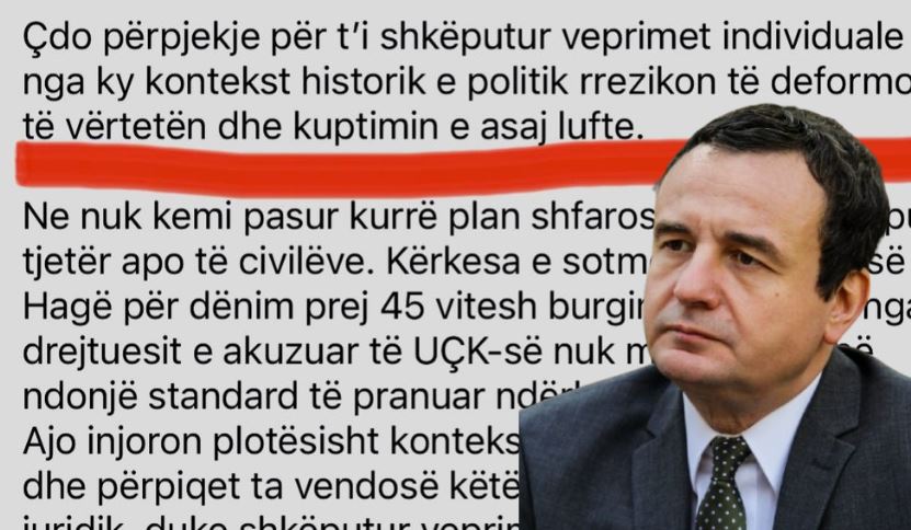 “Më pyesin miq nga Prishtina pse nuk po shprehesh për mikun tënd që sot u ngarkua me 45 vjet burg në pretencën e prokurorisë së Hagës?! Nuk po shprehem dot, pasi ende po mundohem ta gjej ku buron filli logjik që ka ndjekur prokuroria për të dalë me kërkesën për varrosje për së gjalli të katër burrave dhe si kurrë ndonjëherë, fjalët nuk më vijnë në ndihmë për t’u shprehur… Ndjesë, më duhet kohë ta gëlltis gjithë atë mal me mut që nxorri sot ajo prokurori në zemër të Europës demokratike”, ka thënë ai. /Periskopi/