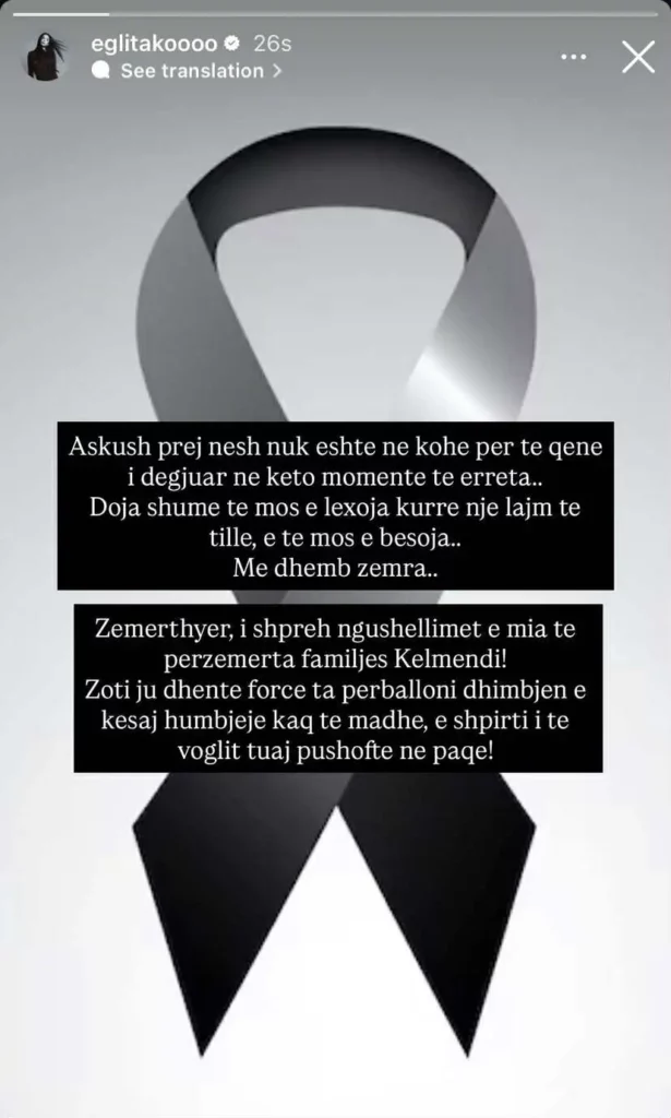 “Askush prej nesh nuk është në kohë për të qenë i dëgjuar në këto momente të errëta.Doja shume te mos e lexoja kurrë një lajm të tillë, e të mos e besoja…Më dhemb zemra..Zemërthyer, i shpreh ngushëllimet e mia të përzemërta familjes Kelmendi!Zoti ju dhëntë forcë ta përballoni dhimbjen e kësaj humbjeje kaq të madhe, e shpirti i të voglit tuaj pushoftë në paqe!”, ka shkruar Tako./Periskopi