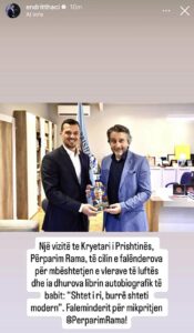 “Një vizitë te Kryetari i Prishtinës, Përparim Rama, të cilin e falënderova për mbështetjen e vlerave të luftës dhe ia dhurova librin autobiografik të babit: ‘Shteti i ri, burrë shteti modern’. Faleminderit për mikpritjen @PerparimRama1”, thuhet në shkrimin e publikuar.