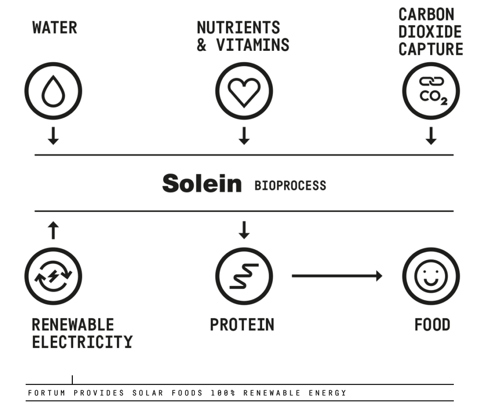 Solar Foods krijon Soleinën duke ekstraktuar dioksidin e karbonit nga ajri duke përdorur teknologjinë për kapjen e karbonit, dhe më pas e kombinon atë me ujë, lëndë ushqyese dhe vitamina, duke përdorur energji të ripërtëritshme 100 për qind nga energjia solare.