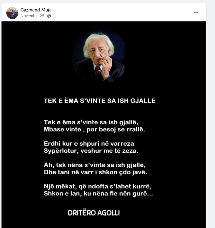 Ai e ka vjerrë në profilin e tij në Facebook [pin to top] edhe një poezi nga Dritëro Agolli të quajtur “Tek e ëma s’vinte sa ish gjallë” . Nuk dihet nëse kjo poezi ka të bëj me marrëdhënien e tij me të vëllain.