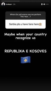 Një prej përgjigjeve ishte: “Në Serbi të lutem, ti ke shumë fansa këtu.” Dhe True Kapo i kundër përgjigjet në këtë mënyrë: “Ndoshta kur shteti juaj të na njohë ne. Republika e Kosovës.”