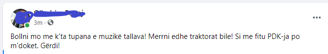 “Bollni mo me k’ta tupana e muzikë tallava! Merrni edhe traktorat bile! Si me fitu PDK-ja po m’doket. Gërdi!” – ka thënë ai.