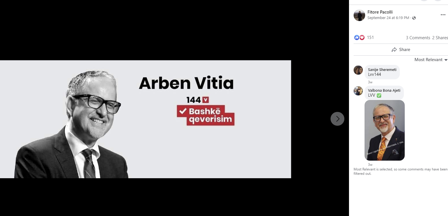 Njëra ndër promovueset më të mëdha të kandidaturës së z. Vitia ishte deputetja e mirënjohur e VV-së me emrin Fitore Pacolli.