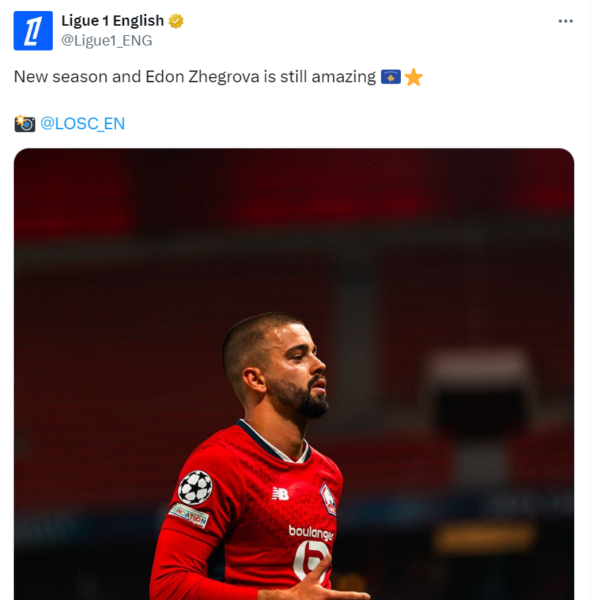 “Sezoni i ri dhe Edon Zhegrova është ende i jashtëzakonshëm”, shkroi liga franceze duke ia përcjellë postimit një flamur të Kosovës dhe një yll.