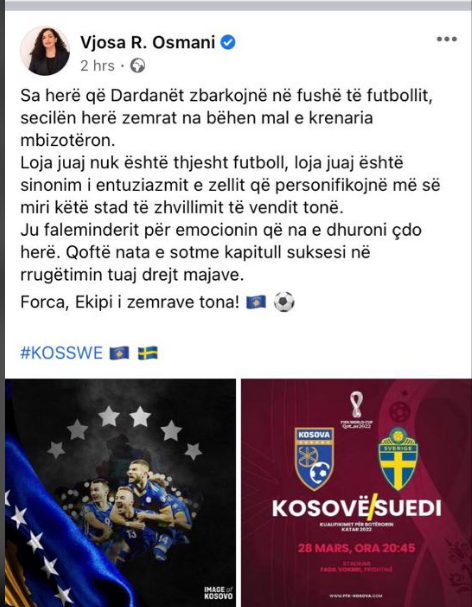 Deputetja, Vjosa Osmani, para dy orëve ka shkruar lidhur me ndeshjen mes Kosovës dhe Suedisë e cila përfundoi me rezultat 0-3 për suedezët.