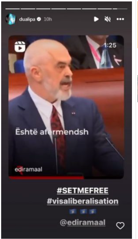 Dua Lipa ka reaguar përmes një postimi në Instagram, ku ka publikuar një pjesë nga fjalimi i kryeministrit në Instastory, duke bërë thirrje për liberalizimin e vizave me Kosovën.