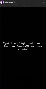 “Tymi i Obliqit është më i fortë se koronavirusi, mos u tutni”, ka shkruar ndër të tjera këngëtarja.