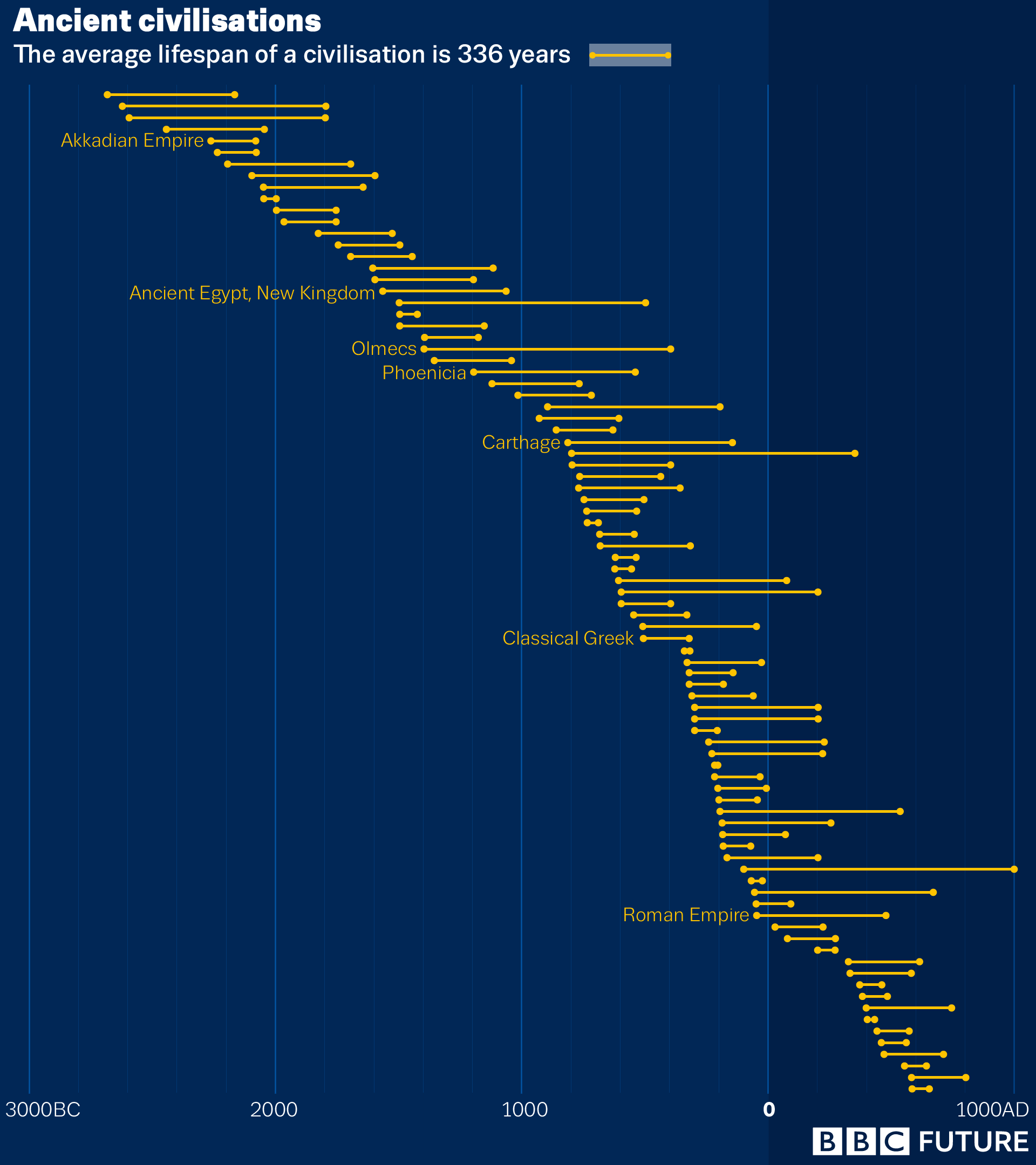 Në grafikun e mëposhtëm, kam krahasuar jetëgjatësinë e disa civilizimeve të kaluara, të cilat i definoj si shoqëri me agrikulturë, shumë qytete, dominancë ushtarake në rajonet e tyre gjeografike dhe me strukturë politike të vazhdueshme. Duke dhënë këtë definicion, të gjitha perandoritë janë civilizime, por jo të gjitha civilizimet janë perandori. Të dhënat janë tërhequr nga dy studime në rritjen dhe rënien e perandorive [për 3000-6000 Para Krishtit dhe 600 para krishtit – 600 Pas Krishtit], dhe një studim mbi civilizimet antike.