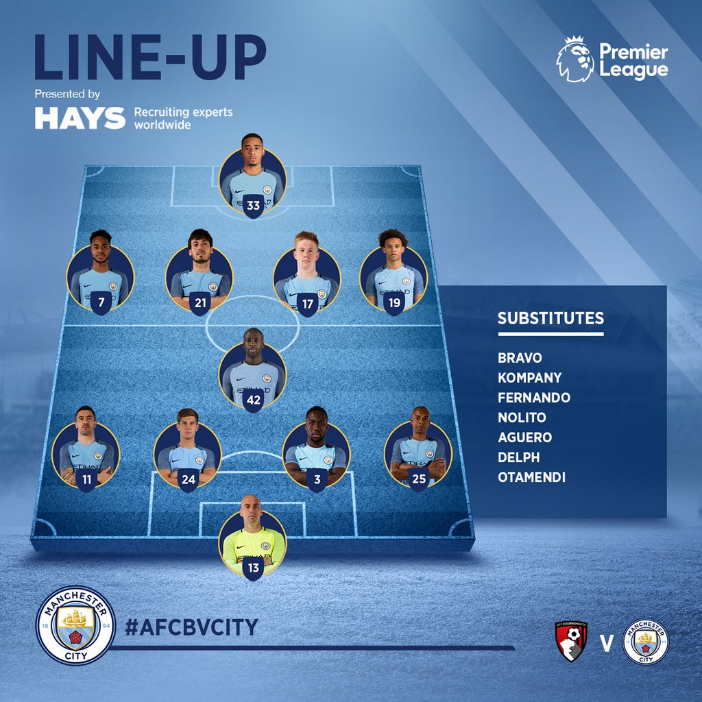 Manchester City: Caballero, Sagna, Kolarov, Stones, Fernandinho, Toure, Sterling, Silva (C), De Bruyne, Sane, G Jesus