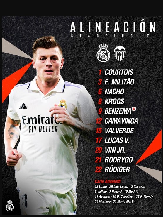 Ancelotti ka startuar sot me Courtois në portë, kurse në mbrojtje janë: Militao, Nacho, Rudiger dhe Vazquez. Në mesfushë nga fillimi për Realin luan: Kroos, Valverde, dhe Camavinga ndërkaq sulmi përbëhet nga: Rodrygo, Benzema dhe Vinicius Junior.