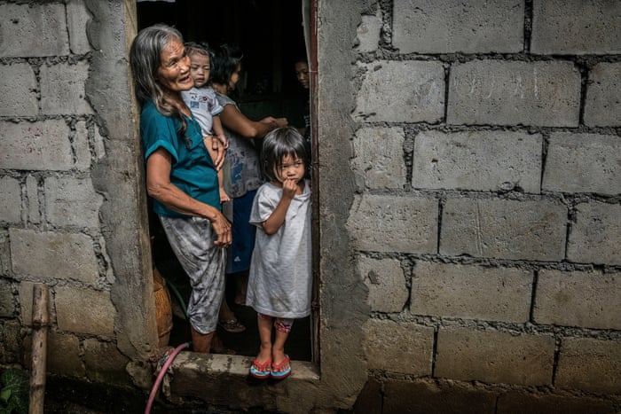 Remy Fernandez, 84 vjeçare, mban nipin e saj, RJ, në hyrjen e shtëpisë së saj të bllokut të shkëmbinjve, ndërtuar pranë një hale të madhe plehrash në Payatas, të metros së Manilas.