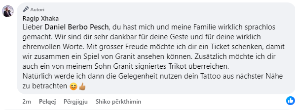 “I dashur Daniel, me të vërtetë më la pa fjalë mua dhe familjen time. Ju jemi shumë mirënjohës për gjestin tuaj dhe për fjalët tuaja vërtet nderuese. Me kënaqësi të madhe dua t’ju jap një biletë që të shikojmë së bashku një ndeshje të Granitit. Do të doja t’ju dhuroja edhe një fanellë të firmosur nga djali im Graniti. Sigurisht që më pas do të përfitoj nga rasti për të parë nga afër tatuazhin tuaj”, ka shkruar Ragip Xhaka.
