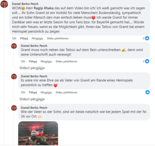 “Zoti Ragip Xhaka, ky jam unë në video! Unë as nuk di çfarë të them … Djali juaj Graniti është model për shumë njerëz! Me këmbë në tokë, personazh dhe një person i mrekullueshëm që thjesht duhet ta duash Unë do t’i jem gjithmonë mirënjohës Granitit për atë që bëri për ne tifozët dhe për Bayer04 sezonin e kaluar… Do të isha shumë i lumtur nëse do të kishte mundësi. Duke ju treguar tatuazhin e Granitit personalisht në një lojë në shtëpi. Granit duhet të firmosë pranë tatuazhit në këmbën e tij, atëherë edhe firma e tij do të përjetësohet!”, ka komentuar Daniel në këtë video.