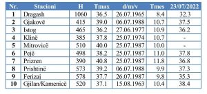 Rekordin për temperaturat më të larta ndonjëherë e mban Prizreni me 40.8 gradë Celsius të regjistruara më 1987 dhe Mitrovica me 40 gradë Celsius, temperaturë kjo që u regjistrua po ashtu në vitin 87.