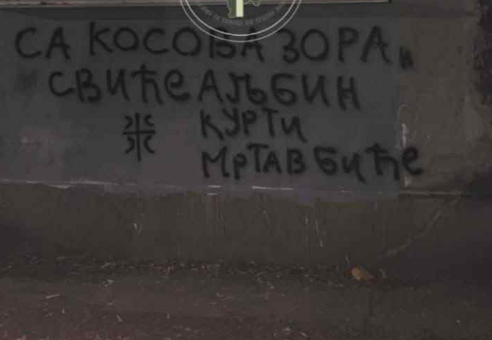 Grafitet e vendosua në gjuhën serbe, në shqip kanë kuptimin “Kur në Kosovë do të agojë, Albin Kurti më s’do të rrojë”.