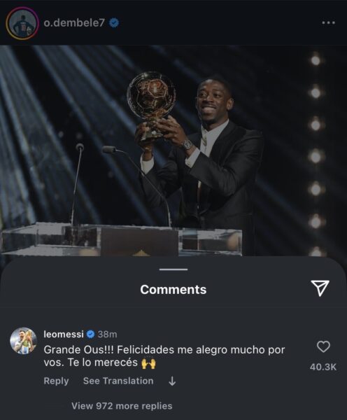 “Grande, Ous. Urime, jam mjaft i lumtur për ty. Ti e ke merituar këtë”, i komentoi Messi futbollistit të PSG`së në rrjetet sociale.