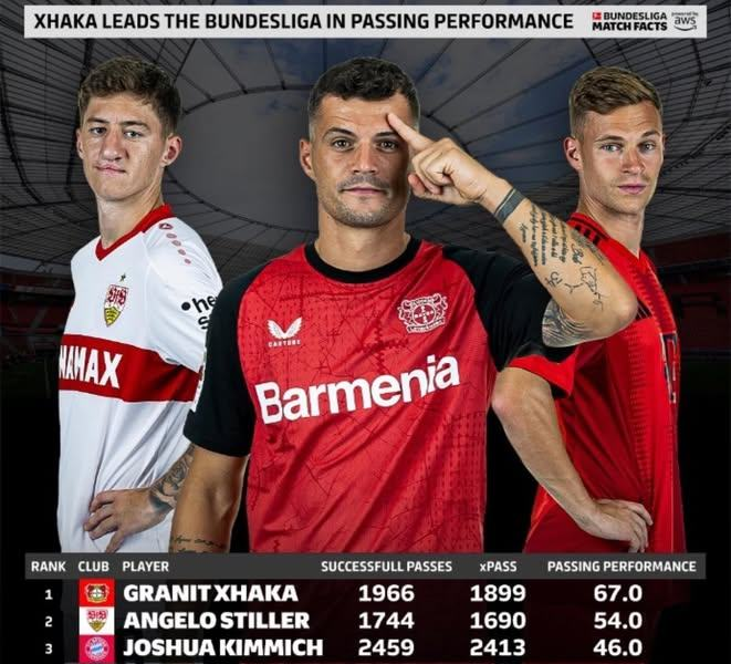 Sipas statistikave të fundit nga Bundesliga Match Facts, mesfushori shqiptar nga Kosova, i cili luan për Bayer Leverkusen, kryeson Bundesligën për performancën më të lartë në pasime.