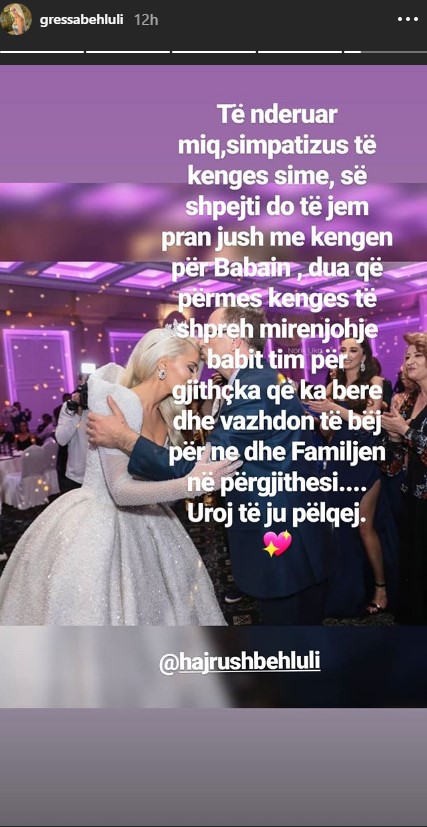 “Të nderuar miq, simpatizues të këngës sime, së shpejti do të jem pran jush me këngë për babain, dua që përmes këngës të shpreh mirënjohjen babait tim për gjithçka që ka bërë dhe vazhdon të bëj për ne dhe familjen në përgjithësi. Uroj të ju pëlqej”, ka shkruar ajo pranë fotos së shkëputur nga dasma.