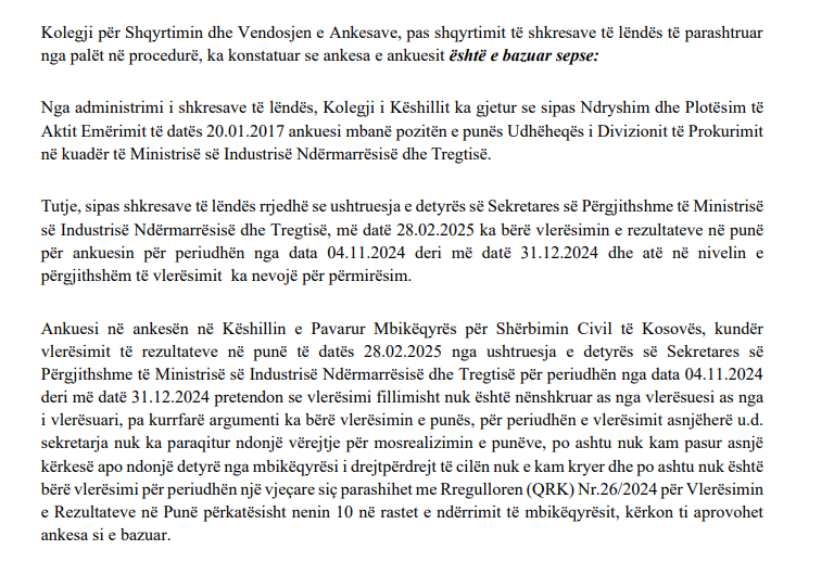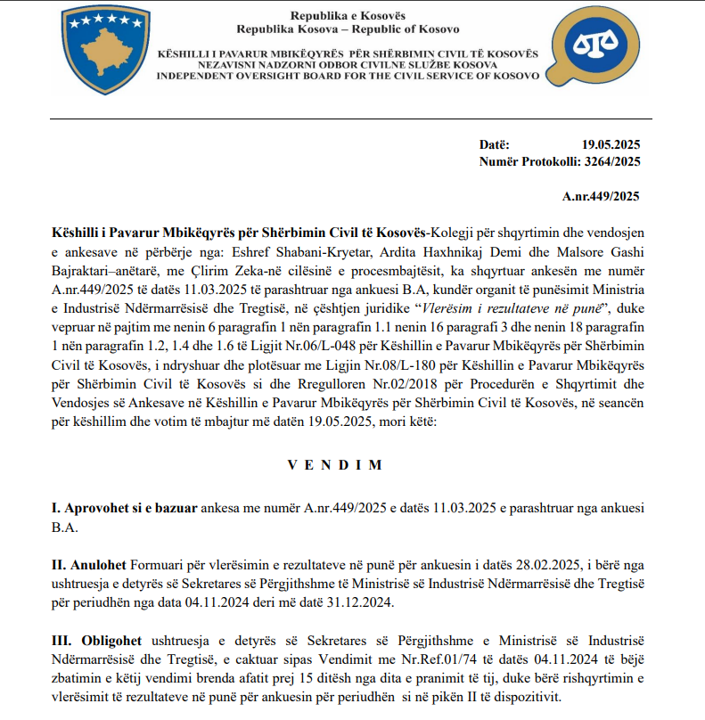 “Anulohet Formuari për vlerësimin e rezultateve në punë për ankuesin i datës 28.02.2025, i bërë nga ushtruesja e detyrës së Sekretares së Përgjithshme të Ministrisë së Industrisë Ndërmarrësisë dhe Tregtisë për periudhën nga data 04.11.2024 deri më datë 31.12.2024. Obligohet ushtruesja e detyrës së Sekretares së Përgjithshme e Ministrisë së Industrisë Ndërmarrësisë dhe Tregtisë, e caktuar sipas Vendimit me Nr.Ref.01/74 të datës 04.11.2024 të bëjë zbatimin e këtij vendimi brenda afatit prej 15 ditësh nga dita e pranimit të tij, duke bërë rishqyrtimin e vlerësimit të rezultateve në punë për ankuesin për periudhën si në pikën II të dispozitivit”, thuhet në vendim.