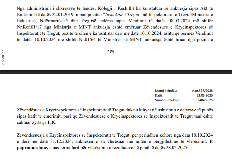 “Nga administrimi i shkresave të lëndës, Kolegji i Këshillit ka konstatuar se ankuesja sipas Akt të Emërimit të datës 22.01.2019, mban pozitën “Inspektor i Tregut” në Inspektoratin e Tregut/Ministria e Industrisë, Ndërmarrësisë dhe Tregtisë, ndërsa sipas Vendimit të datës 08.03.2024 më shifër Nr.Ref.01/17 nga Ministrja e MINT ankuesja është emëruar Zëvendësues e Kryeinspektores së Inspektoratit të Tregut, pozitë të cilën e ka ushtruar deri me datë 10.10.2024, ashtu që përmes Vendimit të datës 10.10.2024 me shifër Nr.01/64 të Ministres së MINT, ankuesja është liruar nga pozita e Numri i lëndës: A.nr.537/2025 Datë: 22.05.2025 Numër Protokolli: 3404/2025 3 (6) 0 Zëvendësues e Kryeinspektores së Inspektoratit të Tregut duke u kthyer në ushtrimin e detyrave të punës sipas katit të emërimit, pasi që Zëvendësuese e Kryeinspektores së Inspektoratit të Tregut tani është caktuar zyrtarja E.K,. Zëvendësuesja e Kryeinspektores së Inspektoratit të Tregut, për periudhën kohore nga data 10.10.2024 e deri me datë 31.12.2024, ankuesen e ka vlerësuar me notën e përgjithshme të vlerësimit: E papranueshme, sipas formularit për vlerësimin e rezultateve në punë të datës 28.02.2025”, thuhet në lëndën e Salihut që e ka administruar KPMSHC-ja.