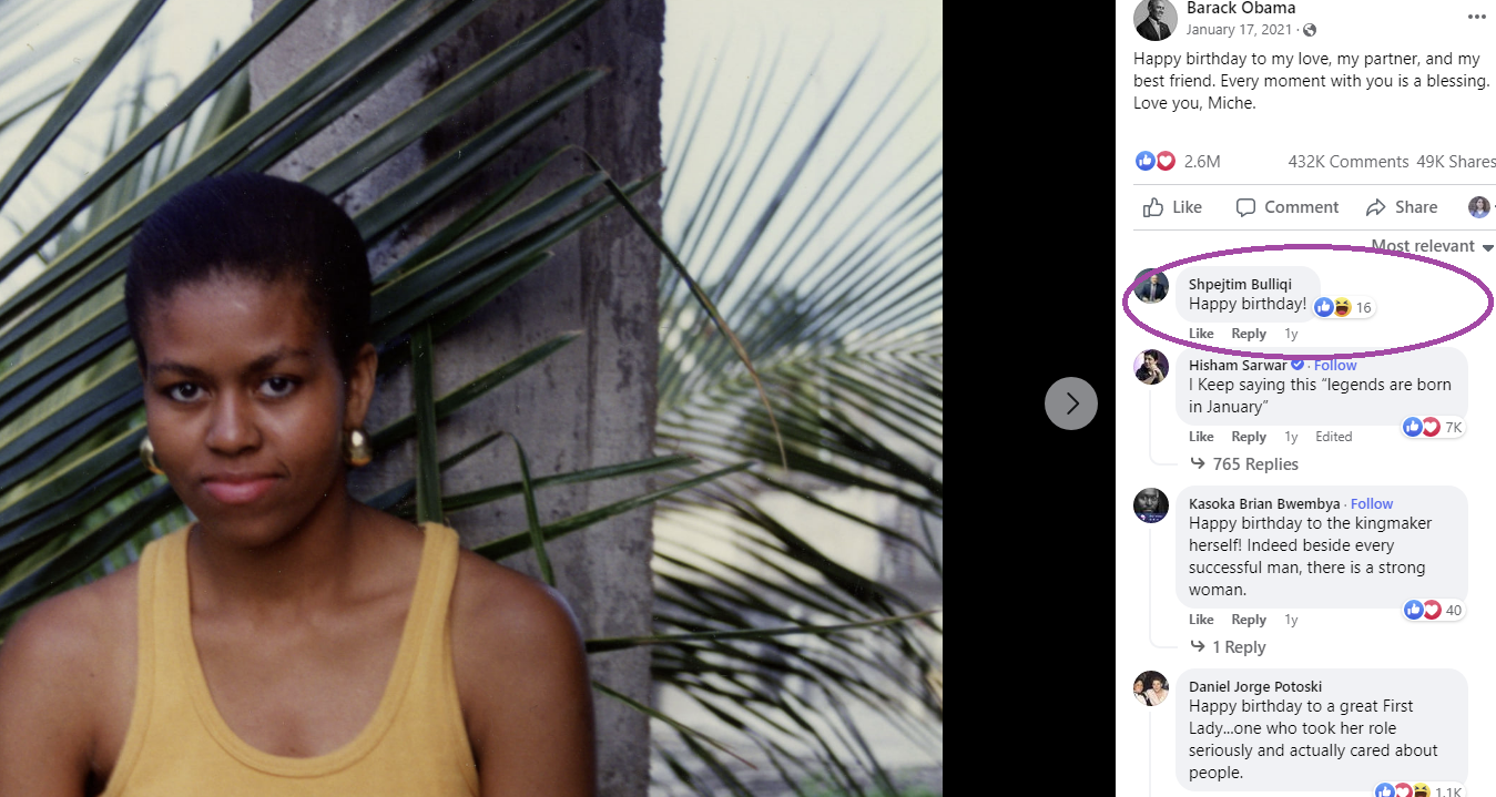 Në statusin që Presidenti Obama, kishte shkruar për gruan e tij, kryetari i Podujevës zoti Shpejtim Bulliqi kishte shkruar: Happy Birthday (Gëzuar ditëlindjen).
