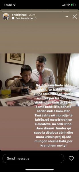 “Jam shumë i lumtur që sapo ia dëgjova zërin dhe mora urimin prej tij. Më mungon shumë babi, por krenohem me ty”, ka shkruar ai.