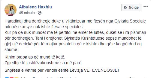 Haxhiu në një shkrim të bërë në Facebook ka shkruar se, Haradinaj ka dhënë dorëheqje duke u viktimizuar me ftesën nga Gjykata Speciale, që sipas deputetes arsye nuk ishte ftesa e speciales.