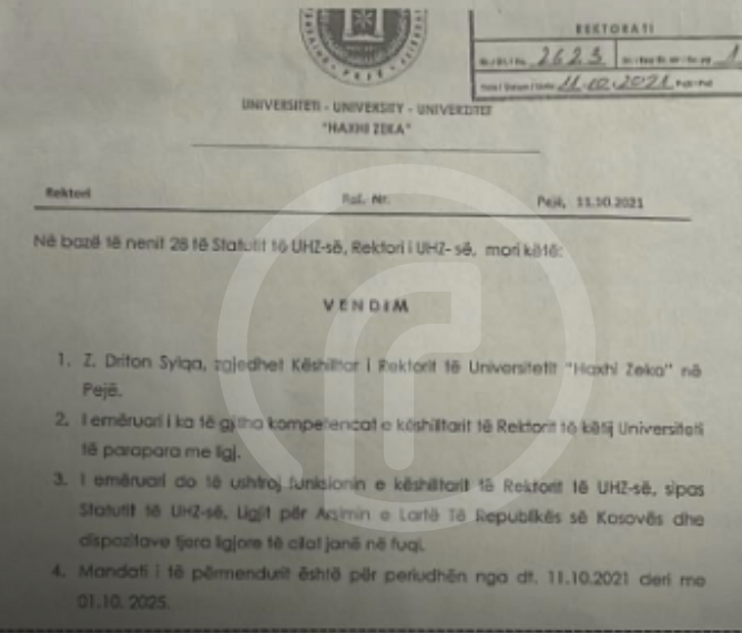 Në dokumentin e siguruar nga Periskopi, shihet se në vendimin e nxjerrur nga Universiteti i Pejës është zgjedhur Driton Sylqa, këshilltar i Rektorit të UHZ në Pejë, më datë 11.10.2021.