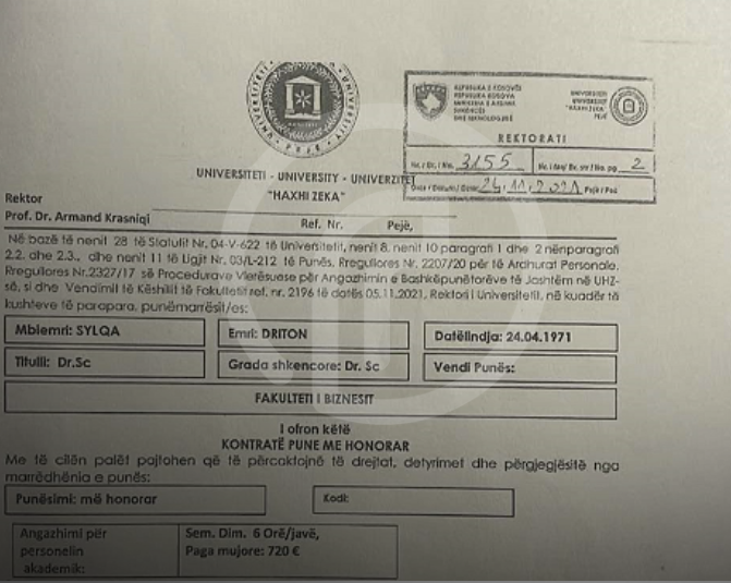 Angazhimi i Driton Sylqes në procesin e mësimdhënies në Fakultetin e Biznesit gjatë kohës kur ishte këshilltar i Rektorit (në semestrin dimëror prej tetorit e deri më 15.02.2022) është në kundërshtim me nenin 7, pikën 12 të rregullores për procedurat vlerësuese për angazhimin e bashkëpunëtorëve të jashtëm në “Universitetin e Pejës “Haxhi Zeka”, nuk mund të angazhohen kandidatë që janë pjesë e administratës”. /Periskopi/