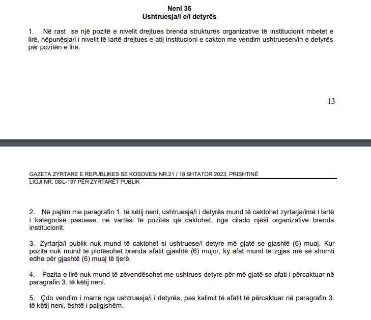 Ndër të tjera, znj. Baftiu-Hasani kontratën e rregulltë të punës e ka zyrtare për çështje juridike në Fakultetin e Agrobiznesit, pozitë kjo e kategorisë profesionale – ndërsa ushtron pozitën e drejtuesit të lartë, që është në kundërshtim me nenin 35 të Ligjit për Zyrtar Publik;