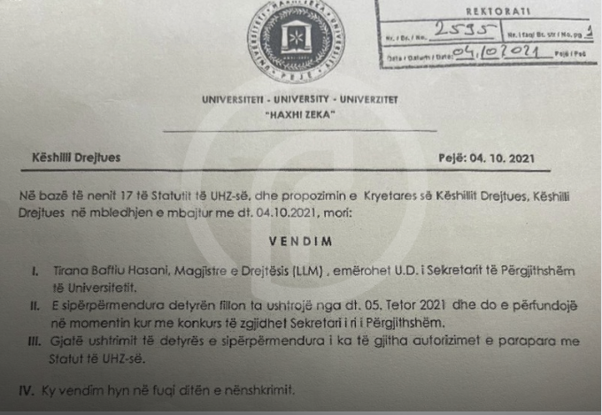 Shkelje drastike dyshohet të kenë ndodhur në Universitetin e Pejës “Haxhi Zeka”, ku në hulumtimin e pestë me radhë të Periskopit, përfshihet u.d sekretarja, znj. Tirana Baftiu Hasani. Këshilli Drejtues në Universitetin e Pejës “Haxhi Zeka” të cilin e udhëheq Majlinda Belegu, në mbledhjen e mbajtur më datë 04.10.2021 ka emëruar ushtrues detyre (u.d) sekretare e përgjithshme – pa pasur kuorum – znj. Tirana Baftiu Hasani.